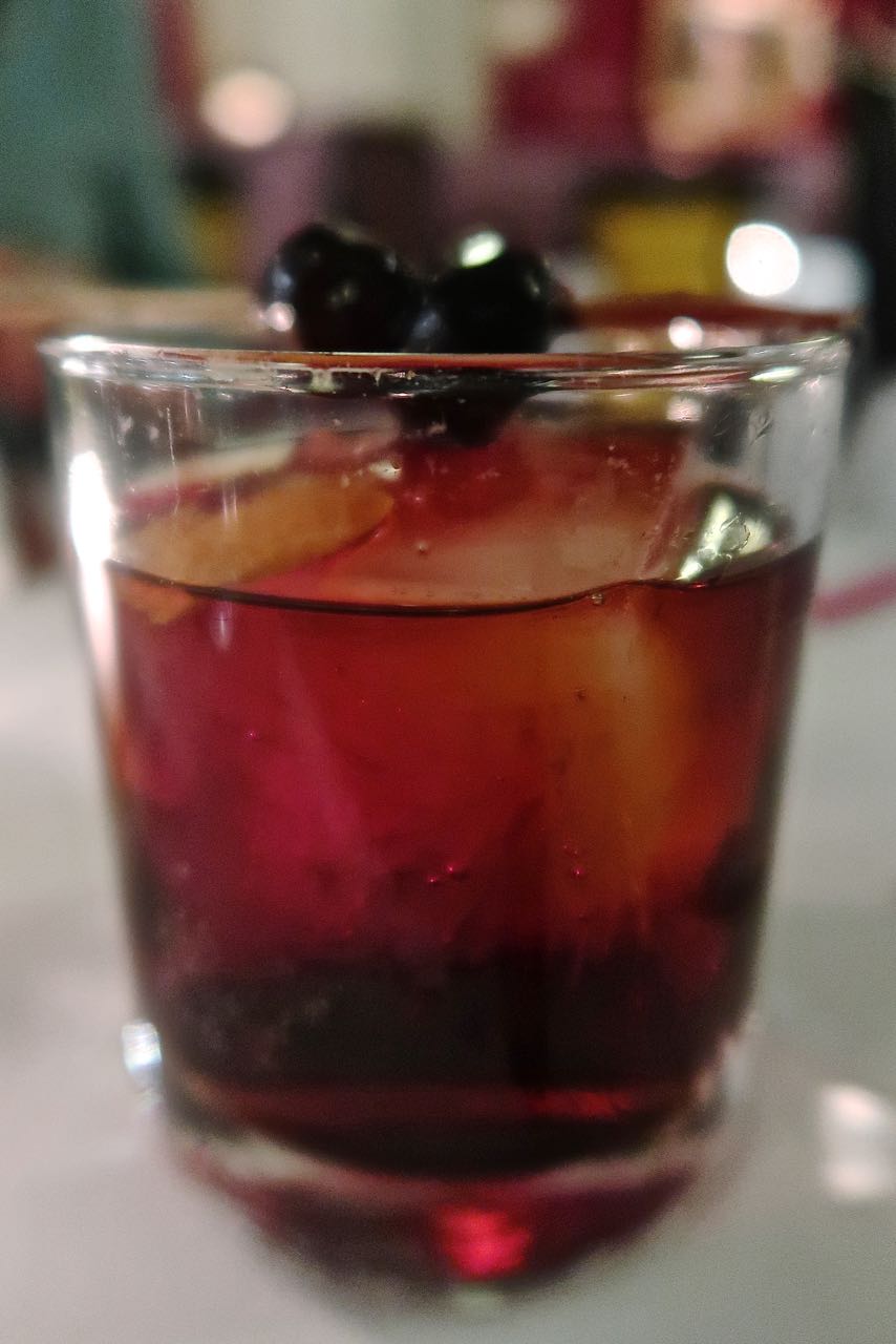 Pink Tapatîa made with Tromba Blanco, guajillo-arbol infused aperol, lime, grapefruit, pink peppercorn-epazote infused agave, celery bitters, shaken, on the rocks