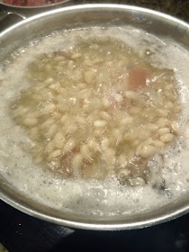 The beans, pancetta and pork belly are brought to a boil and blanched for 10 minutes,